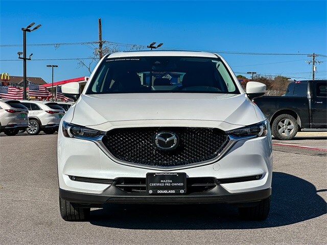 Certified. This 2021 Mazda CX-5 Grand Touring Reserve in Snowflake White Pearl Mica comes with the following features: 2.5L I4 6-Speed Automatic AWD ONE OWNER and CERTIFIED Mazda Certified Pre-Owned Certified Mazda Certified Pre-Owned Certified, 10 Speakers, 4-Wheel Disc Brakes, 4.411 Axle Ratio, ABS brakes, Air Conditioning, Alloy wheels, AM/FM radio: SiriusXM, AppLink/Apple CarPlay and Android Auto, Auto High-beam Headlights, Auto-dimming Rear-View mirror, Automatic temperature control, Bose 10-Speaker Premium Audio Sound System, Brake assist, Bumpers: body-color, Cargo Mat, Delay-off headlights, Driver door bin, Driver vanity mirror, Dual front impact airbags, Dual front side impact airbags, Electronic Stability Control, Emergency communication system: MAZDA CONNECT, Exterior Parking Camera Rear, Four wheel independent suspension, Front anti-roll bar, Front Bucket Seats, Front Center Armrest, Front dual zone A/C, Front fog lights, Front reading lights, Fully automatic headlights, Garage door transmitter: HomeLink, Heads-Up Display, Heated door mirrors, Heated front seats, Heated rear seats, Heated steering wheel, Heated/Ventilated Front Bucket Seats, Illuminated entry, Leather Seat Trim, Leather Shift Knob, Low tire pressure warning, Memory seat, Occupant sensing airbag, Outside temperature display, Overhead airbag, Overhead console, Panic alarm, Passenger door bin, Passenger vanity mirror, Power door mirrors, Power driver seat, Power Liftgate, Power moonroof, Power passenger seat, Power steering, Power windows, Radio data system, Radio: AM/FM/HD Audio System, Rain sensing wipers, Rear anti-roll bar, Rear Parking Sensors, Rear reading lights, Rear seat center armrest, Rear window defroster, Rear window wiper, Remote keyless entry, Snowflake White Pearl Mica Paint, Speed control, Speed-sensing steering, Split folding rear seat, Spoiler, Steering wheel mounted audio controls, Tachometer, Telescoping steering wheel, Tilt steering wheel, Traction control, Trip computer, Turn signal indicator mirrors, Variably intermittent wipers, Ventilated front seats, and Wheels: 19" x 7J Aluminum Alloy.