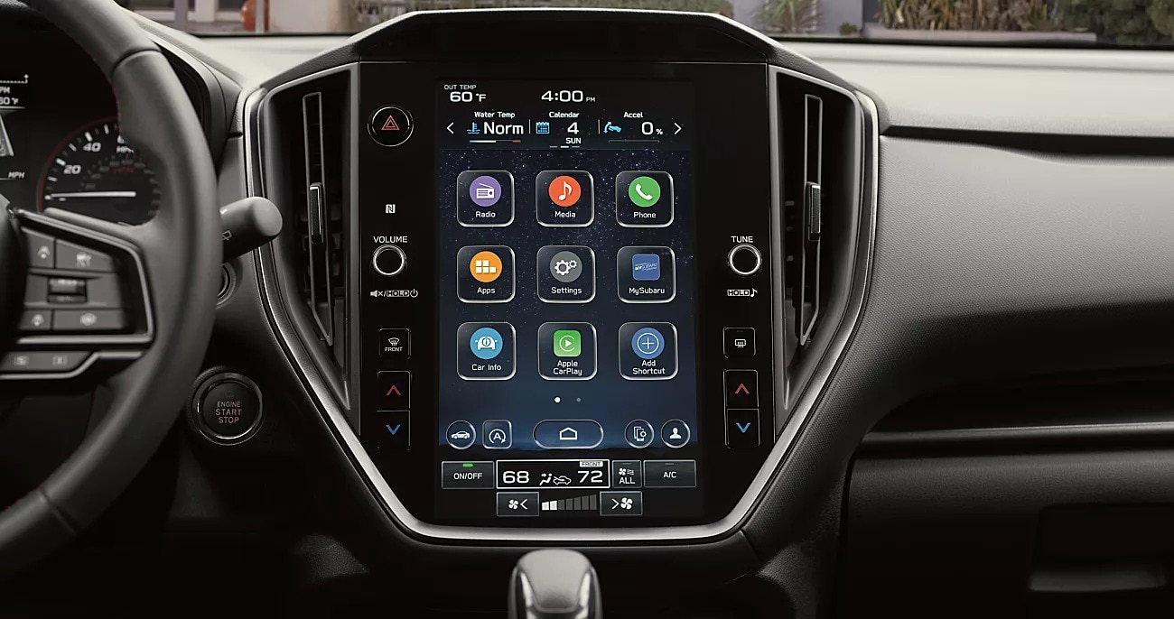 - Base: Includes a 152-horsepower engine, adaptive LED headlights, roof rails, dual-zone automatic climate control, dual seven-inch touchscreens, wired Android Auto™ and Apple CarPlay®, four speakers, and Subaru EyeSight®.