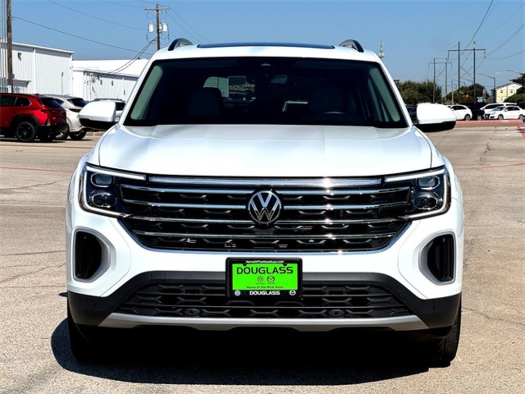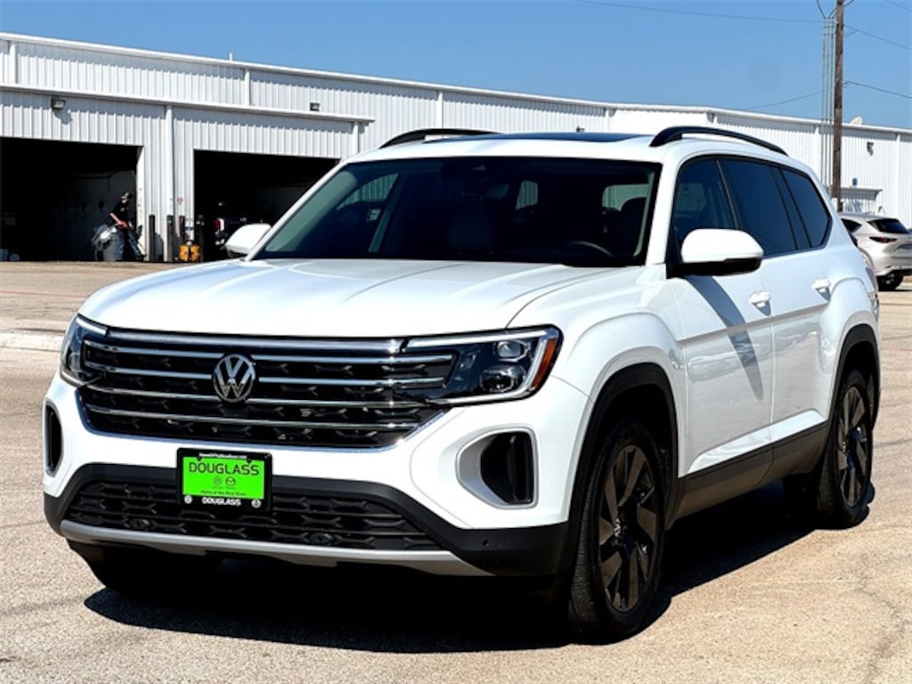 Certified. This 2025 Volkswagen Atlas 2.0T SE w/Technology in Pure White comes with the following features: 2.0L TSI 8-Speed Automatic with Tiptronic FWD Black Wheel Package (Wheels: 20" Multi-Spoke Black Painted Alloy), Panoramic Sunroof Package (Power Tilting & Sliding Panoramic Sunroof), and Volkswagen Certified Pre-Owned Certified Black Wheel Package (Wheels: 20" Multi-Spoke Black Painted Alloy), Panoramic Sunroof Package (Power Tilting & Sliding Panoramic Sunroof), Volkswagen Certified Pre-Owned Certified, 3rd row seats: split-bench, 4-Wheel Disc Brakes, 6 Speakers, ABS brakes, Air Conditioning, Alloy wheels, AM/FM radio: SiriusXM with 360L, Auto High-beam Headlights, Auto-dimming Rear-View mirror, Automatic temperature control, Brake assist, Bumpers: body-color, Compass, Delay-off headlights, Driver door bin, Driver vanity mirror, Dual front impact airbags, Dual front side impact airbags, Electronic Stability Control, Emergency communication system: VW Car-Net Safe & Secure 5-year, Exterior Parking Camera Rear, Four wheel independent suspension, Four-wheel Independent Suspension, Front anti-roll bar, Front Bucket Seats, Front Center Armrest, Front dual zone A/C, Front fog lights, Front reading lights, Fully automatic headlights, Heated & Actively Ventilated Front Bucket Seats, Heated door mirrors, Heated front seats, Heated steering wheel, Illuminated entry, Low tire pressure warning, Occupant sensing airbag, Outside temperature display, Overhead airbag, Overhead console, Panic alarm, Passenger door bin, Passenger vanity mirror, Perforated V-Tex Leatherette Seating Surfaces, Power door mirrors, Power driver seat, Power Liftgate, Power steering, Power windows, Radio data system, Radio: MIB3 Composition Media, Rain sensing wipers, Rear air conditioning, Rear anti-roll bar, Rear reading lights, Rear seat center armrest, Rear window defroster, Rear window wiper, Remote keyless entry, Security system, Speed control, Speed-sensing steering, Split folding rear seat, Spoiler, Steering wheel mounted audio controls, Tachometer, Telescoping steering wheel, Tilt steering wheel, Traction control, Trip computer, Turn signal indicator mirrors, Variably intermittent wipers, Ventilated front seats, and Wheels: 20" 2-Tone Machined Alloy.
